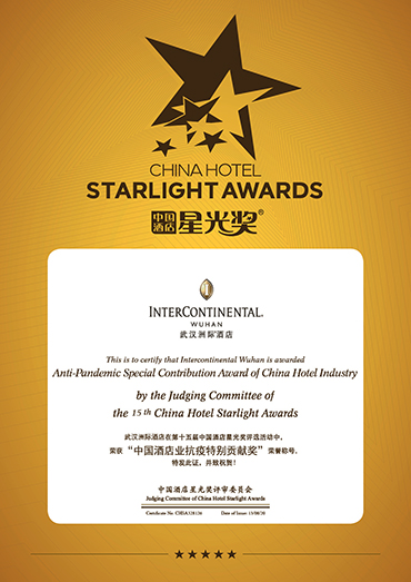 2020亞洲酒店及旅游論壇暨第十四屆中國酒店星光獎評選,于2020年8月12日-14日在上海舉行,武漢洲際酒店榮獲中國酒店星光獎――中國酒店業(yè)抗疫特別貢獻(xiàn)獎。