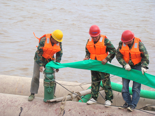 接到緊急訴求后,凌晨3點(diǎn)50分左右,漢口供水部維修工程處搶修隊(duì)攜帶8臺(tái)潛水泵,連夜奔赴現(xiàn)場(chǎng),并立即展開(kāi)應(yīng)急搶修工作。由于凌晨氣溫較低,正遇武漢市大風(fēng)降溫天氣,江堤地勢(shì)復(fù)雜,土坡、軟泥、大堆亂石,路面崎嶇不平,車輛行駛的路面有限,加之周邊缺照明設(shè)備,能見(jiàn)度低,給搶修工作造成了較大阻力,搶修隊(duì)員們只能徒手將發(fā)電機(jī)和抽水泵抬到取水點(diǎn)安置。在全部抽水設(shè)備安置妥當(dāng)后,嘩嘩的江水源源不斷地被抽上來(lái)。江面上5、6級(jí)的大風(fēng)吹得取水設(shè)備在江水里搖擺不定,時(shí)而沖脫了取水泵管,搶修隊(duì)員顧不上隨時(shí)被江浪卷走的危險(xiǎn),一次次的將沖脫的設(shè)備提起來(lái),安裝好,再抽水。經(jīng)過(guò)一個(gè)多星期的連續(xù)奮戰(zhàn),武漢乙烯項(xiàng)目的用水問(wèn)題終于得到了緩解。
