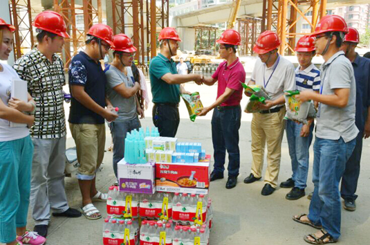 8月3日,公司領(lǐng)導(dǎo)班子成員帶領(lǐng)工會、綜合部、工程監(jiān)理管理人員分赴一線,為一線員工送去礦泉水、綠豆、花露水等防暑降溫物品。