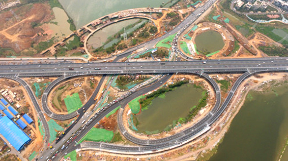 野芷湖立交橋作為連接三環(huán)線與南大門的重要交通樞紐,原有的4股上下橋匝道已無法滿足日益增加的車流量,成為當(dāng)?shù)亟煌ǖ摹澳c梗阻”。集團公司投資建設(shè)的新野芷湖立交橋是其中重要的節(jié)點工程,將建成全市第一座分離式集散車道的樞紐立交,其中南北兩側(cè)共計4條匝道在改造后將變成南北各4條匝道,同時在三環(huán)線上增加幫寬橋,使單側(cè)橋面寬度增加2車道,專門用于分流下行匝道車輛,較好地起到行車疏導(dǎo)作用。